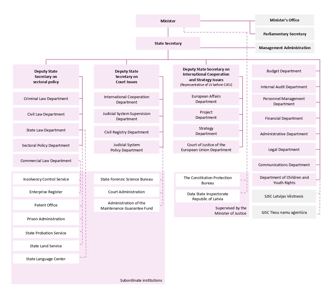 The Ministry of Justice is the leading State administrative institution in the sectors of justice (legal system policy, judiciary system and court administration), as well as in other fields of the State policy referred to in these Regulations.