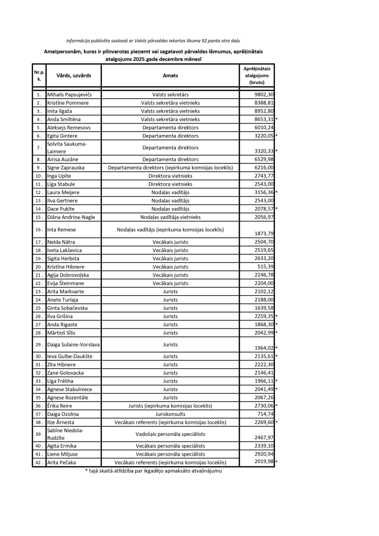 Saskaņā ar Valsts pārvaldes iekārtas likuma 92. panta otro daļu publicējam šādu informāciju: aprēķinātais atalgojums 2025.gada decembrī amatpersonām, kuras ir pilnvarotas pieņemt vai sagatavot pārvaldes lēmumus.
