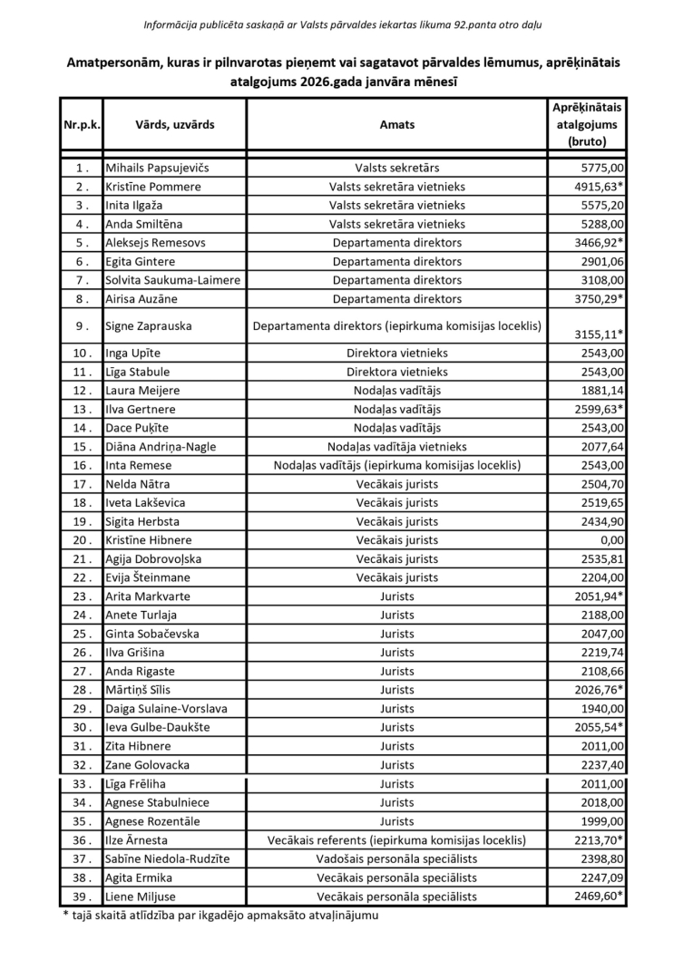 Saskaņā ar Valsts pārvaldes iekārtas likuma 92. panta otro daļu publicējam šādu informāciju: aprēķinātais atalgojums 2026.gada janvārī amatpersonām, kuras ir pilnvarotas pieņemt vai sagatavot pārvaldes lēmumus.