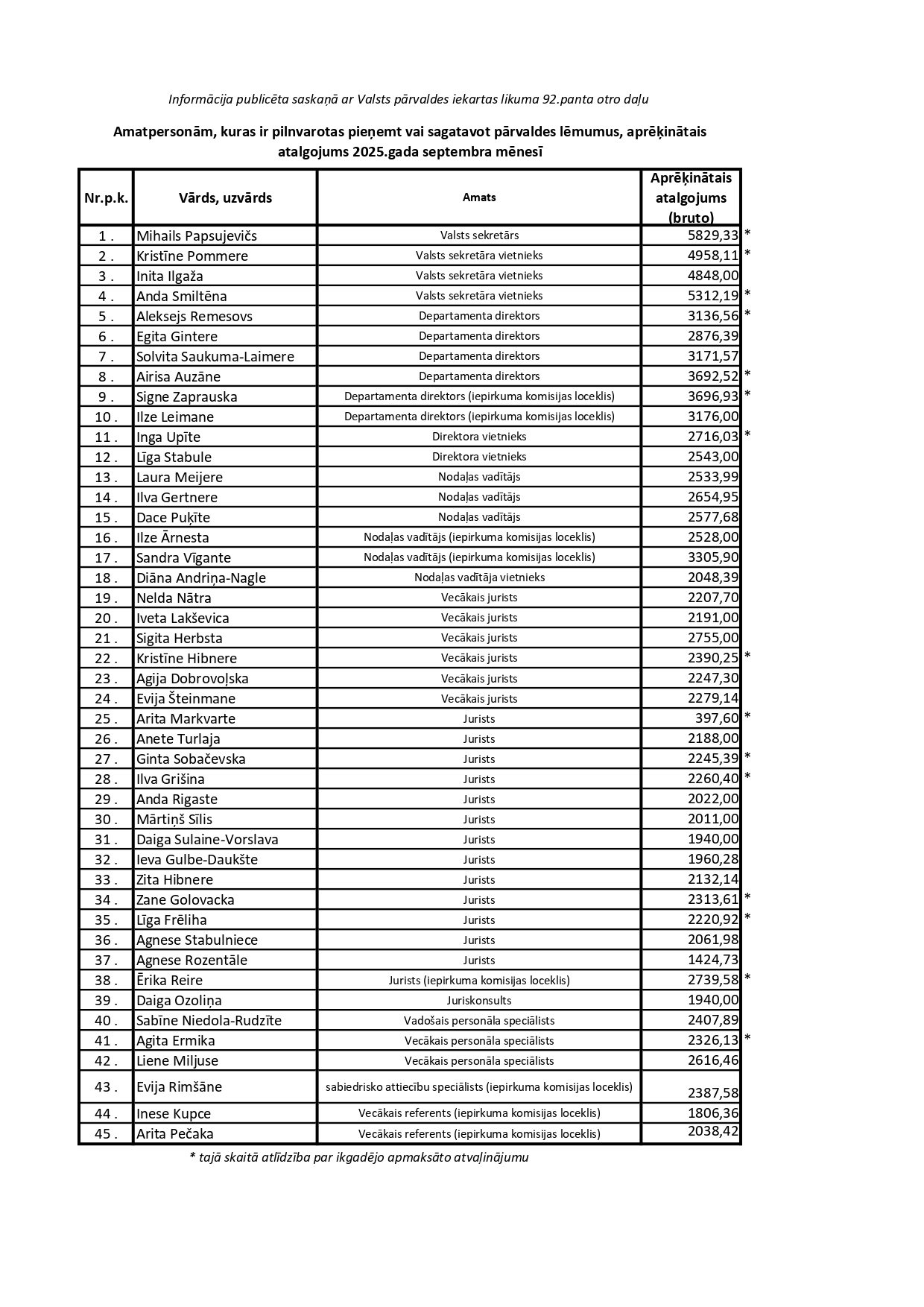 Saskaņā ar Valsts pārvaldes iekārtas likuma 92. panta otro daļu publicējam šādu informāciju: aprēķinātais atalgojums 2025.gada septembrī amatpersonām, kuras ir pilnvarotas pieņemt vai sagatavot pārvaldes lēmumus.