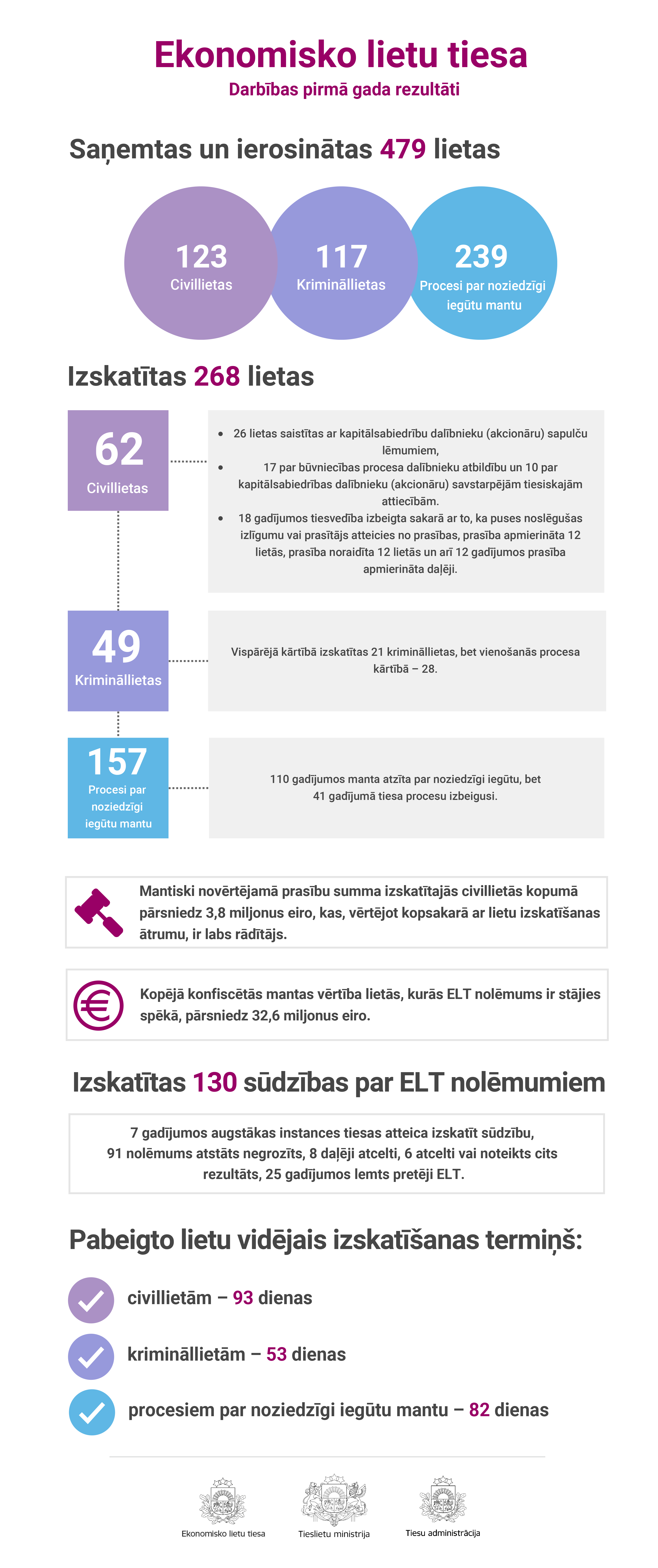 ELT savas darbības pirmajā gadā izskatījusi 268 lietas, no tām 62 civillietas, 49 krimināllietas, kā arī 157 procesus par noziedzīgi iegūtu mantu. Kopējā konfiscētās mantas vērtība lietās, kurās ELT nolēmums jau ir stājies spēkā, pārsniedz 32,6 miljonus eiro.