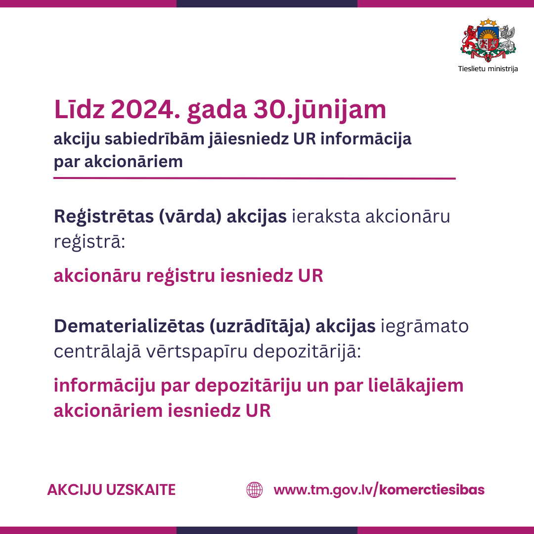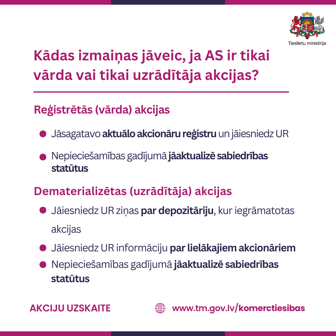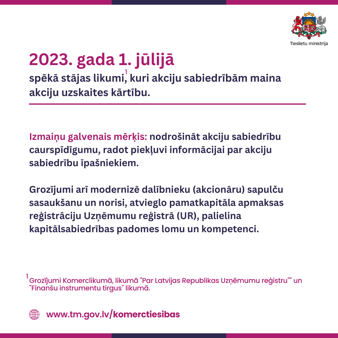 2023. gada 1. jūlijā stājās spēkā izmaiņas likumos, kas paredz modernizēt un padarīt caurskatāmāku akciju sabiedrību darbību, radot pieeju informācijai par akciju sabiedrību īpašniekiem, kā arī mazinot noziedzīgi iegūtu līdzekļu legalizācijas un terorisma un proliferācijas finansēšanas riskus.