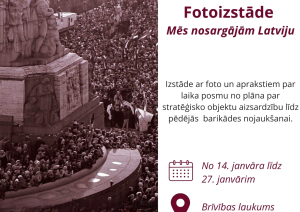 Trešdien, 14. janvārī no plkst. 11.00 līdz 27. janvārim, Brīvības laukumā – Fotoizstāde "Mēs nosargājām Latviju". Izstāde ar foto un aprakstiem secīgi atspoguļo laika posmu no plāna par stratēģisko objektu aizsardzību līdz pat pēdējās barikādes nojaukšanai, ļaujot ieraudzīt barikāžu norisi plašākā vēsturiskā kontekstā. Paralēli vides izstādei 1991. gada barikāžu muzeja mājas lapā www.barikades.lv būs pieejama arī izstādes digitālā versija ar papildu fotogrāfijām.