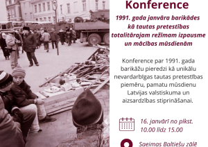 Piektdien, 16. janvārī no plkst. 10.00 līdz 15.00 Saeimas Baltiešu zālē un tiešsaistē – Konference “1991. gada janvāra barikādes kā tautas pretestības totalitārajam režīmam izpausme un mācības mūsdienām”. Konference pulcēs vēsturniekus, tiesību un drošības ekspertus, lai 1991. gada barikāžu pieredzi skatītu gan kā unikālu nevardarbīgas tautas pretestības piemēru, gan kā pamatu mūsdienu Latvijas valstiskuma un aizsardzības spēju stiprināšanai. Konferences pirmajā daļā tiks analizēta barikāžu nacionālā un starptautiskā nozīme, to organizācija, tautas gara pacēlums un ieguldījums Latvijas drošības pamatu veidošanā, savukārt otrajā daļā uzmanības centrā būs nevardarbīgās pretošanās tiesiskie, vēsturiskie un militārie aspekti, sabiedrības loma un gatavība nemilitārai pretestībai kara vai pagaidu okupācijas apstākļos. Diskusijās piedalīsies Egils Levits, Tālavs Jundzis, Renārs Zaļais, Romualds Ražuks, Maija Kūle, Ģirts Valdis Kristovskis, Ineta Ziemele, Guntis Zemītis, Ieva Bērziņa, Vitālijs Rakstiņš u. c. Konference būs skatāma arī tiešsaistē Saeimas mājas lapā, Facebook un YouTube kanālos.