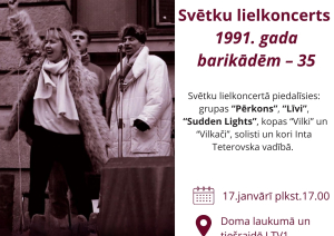 Sestdien, 17. janvārī plkst. 17.00, Doma laukumā – Svētku lielkoncerts “1991. gada barikādēm – 35”. LTV tiešraide. Svētku lielkoncerts veltīts 1991. gada barikāžu 35. gadadienai, barikāžu dalībniekiem, atmiņām un pateicībai. Pasākums godinās barikāžu dalībniekus un atgādinās par Latvijas ceļu uz neatkarīgu un brīvu valsti. Koncerta laikā izskanēs Atmodas laika simboliskās dziesmas un to mūsdienīgās interpretācijas koru, pazīstamu grupu un solistu izpildījumā. Pasākums būs arī emocionāls 1991. gada barikāžu laika atspoguļojums dziesmā, kas mūsdienu jauniešiem, kuri nav piedzīvojuši barikāžu laiku, dos ieskatu šī laika daudzšķautņainībā un iespēju labāk izprast, kāpēc par šādiem notikumiem ir jārunā arī šodien.