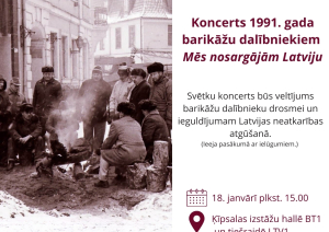 Svētdien, 18. janvārī plkst. 15.00, Ķīpsalas izstāžu halle BT1 – Svētku koncerts 1991. gada barikāžu dalībniekiem “Mēs nosargājām Latviju”. Ieeja ar ielūgumiem. LTV tiešraide. Svētku koncerts “Mēs nosargājām Latviju” 2026. gada 18. janvārī plkst. 15.00 BT1 izstāžu hallē būs īpašs veltījums 1991. gada barikāžu dalībniekiem – viņu drosmei un ieguldījumam Latvijas neatkarības atgūšanā. Koncertā skanēs Zemessardzes orķestra (diriģents Andis Karelis) izpildītie skaņdarbi, tostarp Atmodas laikam raksturīgas dziesmas un to mūsdienu interpretācijas kopā ar koriem un solistiem, savukārt kulminācija būs Jura Kulakova un Normunda Beļska kantāte “Vēstules uz bruģa”, ko atskaņos Zemessardzes orķestris, rokgrupa “Pērkons”, bungu un dūdu grupa “Auļi”, Zemessardzes 51. kājinieku bataljona ansamblis “Dobeles zemesargi”, Rīgas kamerkoris “Ave Sol” un Zemessardzes koris “Stars”. Šis muzikālais vēstījums atspoguļos barikāžu laika emocionālo pieredzi un vienlaikus runās arī uz mūsdienu skatītāju, atgādinot par brīvības cenu un mūsu kopīgo atbildību par Latviju.