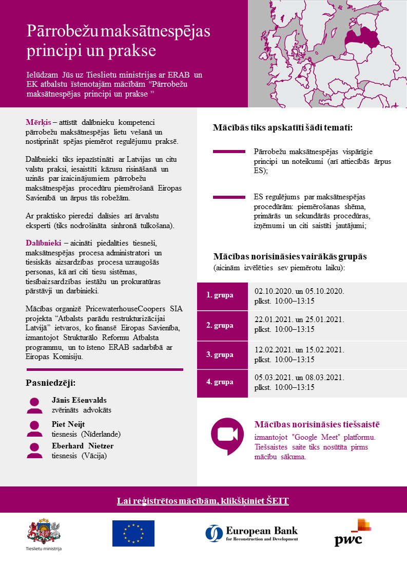 Ielūdzam Jūs uz Tieslietu ministrijas ar ERAB un EK atbalstu īstenotajām mācībām "Pārrobežu maksātnespējas principi un prakse". Pieteikšanās https://www.pwc.com/lv/lv//forms/parrobezu-maksatnespejas-principi-un-prakse.html