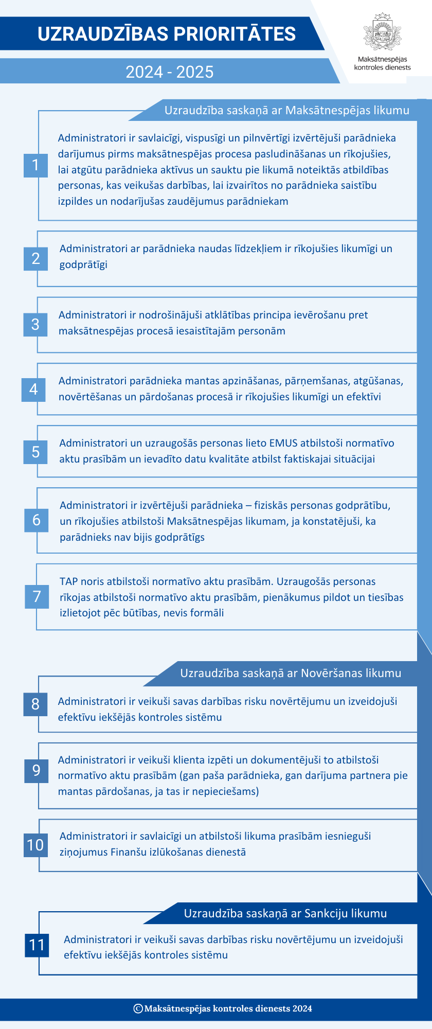 Lai īstenotu mērķtiecīgu, riskos balstītu uzraudzību, 2023.gadā Maksātnespējas kontroles dienests ir izstrādājis maksātnespējas sektora risku novērtējumu noziedzīgi iegūtu līdzekļu legalizācijas novēršanas jomā un sniedzis risku mazinošo pasākumu priekšlikumus. Tāpat izstrādājis Uzraudzības stratēģiju 2024.-2025.gadam, pamatojoties uz iestādes iepriekšējā perioda uzraudzības rezultātiem un ņemot vērā uzņēmējus pārstāvošo nevalstisko organizāciju – Ārvalstu investoru padomes Latvijā, Latvijas Tirdzniecības un rūpniecības kameras un Latvijas Finanšu nozares asociācijas viedokli par prioritātēm maksātnespējas nozarē. “Konsultē vispirms” principa ietvaros par tiesību normu piemērošanu maksātnespējas jomā uzraugāmajiem subjektiem sniegti skaidrojumi, viedokļi, vadlīnijas u.c., katrā konkrētā gadījumā izvēloties efektīvāko saziņas veidu.