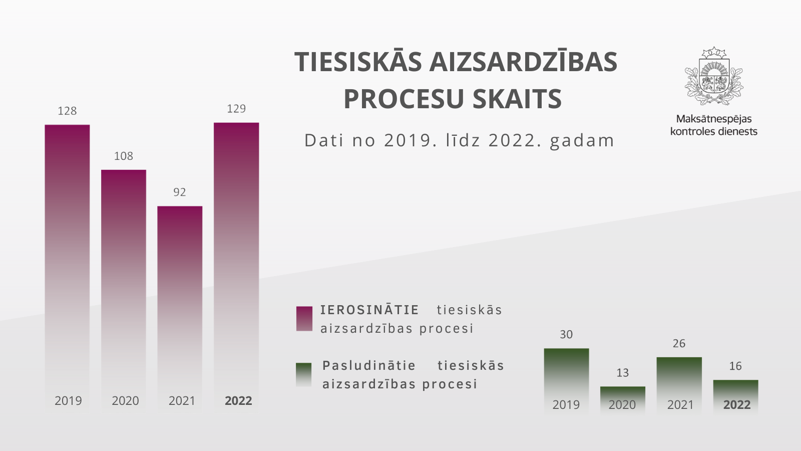 2022. gadā ir palielinājušies centieni glābt savu uzņēmējdarbību, izmantojot tiesiskās aizsardzības procesu. Būtiski pieaudzis ierosināto tiesiskās aizsardzības procesu skaits – ierosinātas 129 lietas. Var secināt, ka tendence uzņēmējiem saglabāt uzņēmējdarbību tiesiskā ceļā palielinās. Tomēr krities ir to gadījumu skaits, kad tiesiskās aizsardzības process tiek pasludināts – 16. Proti, tikai 12% gadījumu kreditori ir saskaņojuši un tiesa ir apstiprinājusi tiesiskās aizsardzības procesa pasākumu plānu. Salīdzinoši, 2021. gadā šis rādītājs bija 28%. Tas liecina, ka uzņēmējiem, kuri nonākuši finansiālās grūtībās, ir rūpīgāk jāstrādā pie kvalitatīvu un dzīvē īstenojamu plānu izstrādes savas uzņēmējdarbības glābšanā un kreditoru pārliecināšanā par to efektivitāti.